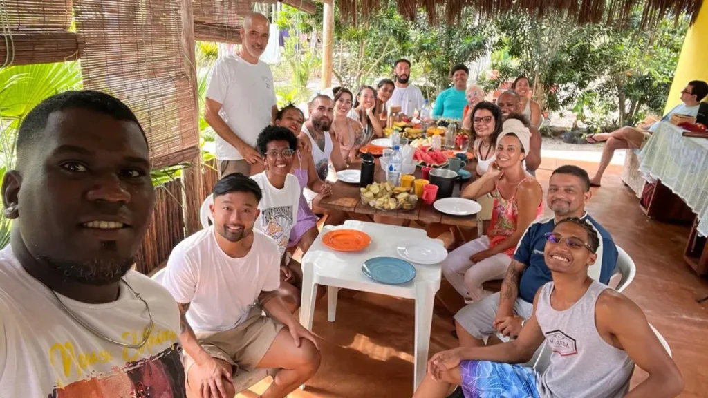 Ativação com atividades comunitárias simples (arrumação coletiva e cuidado do espaço), caminhar leve na natureza ou práticas de grounding.